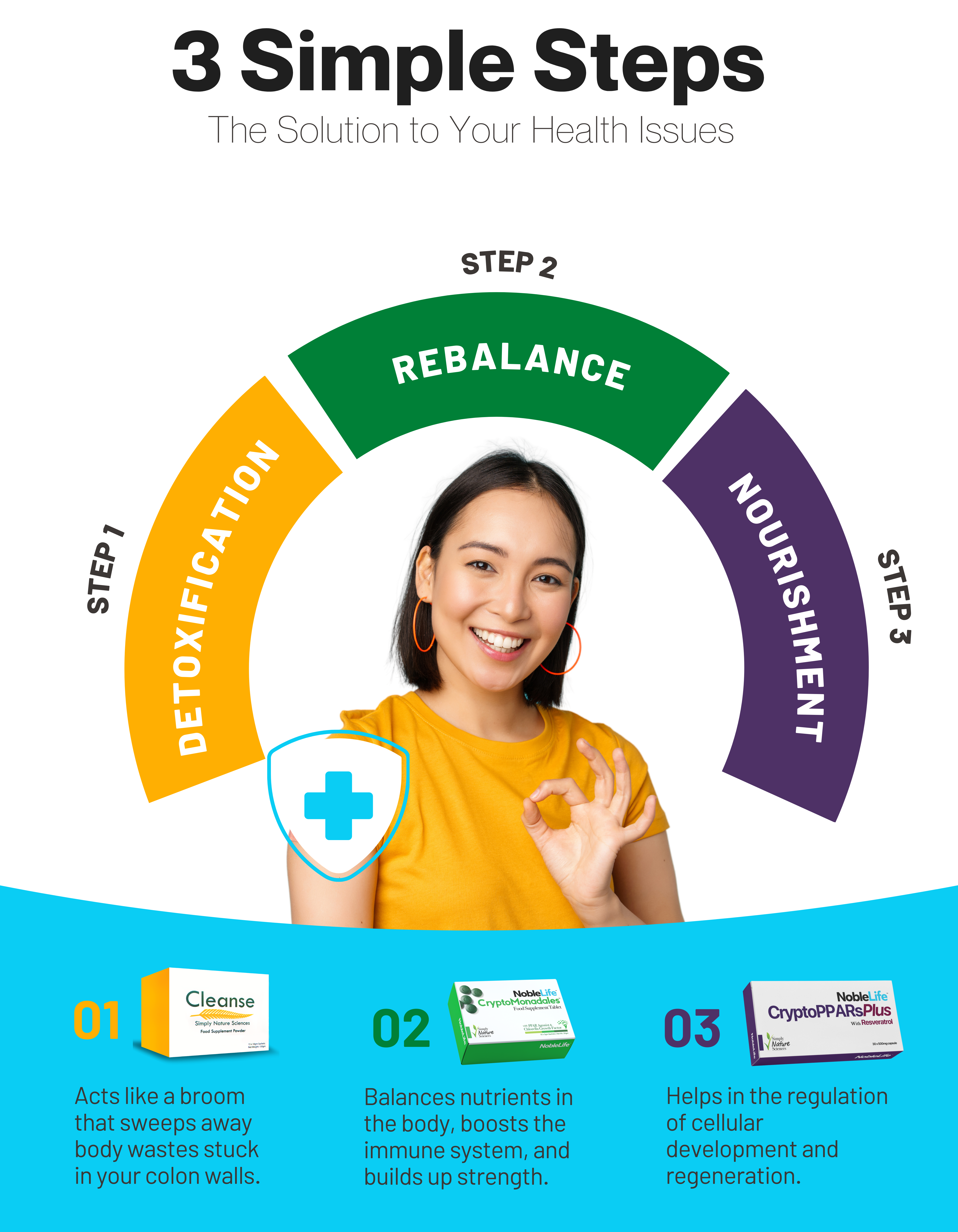 Your total solution to your health issues! Get to choose from one of our natural food supplement bundles; cancer supplements for solution and prevention, supplements for kidney disease, diabetes supplements for solution and diabetes prevention supplements, cardiovascular disease and more. Discover Noble Life's 3 simple steps to a healthy you.